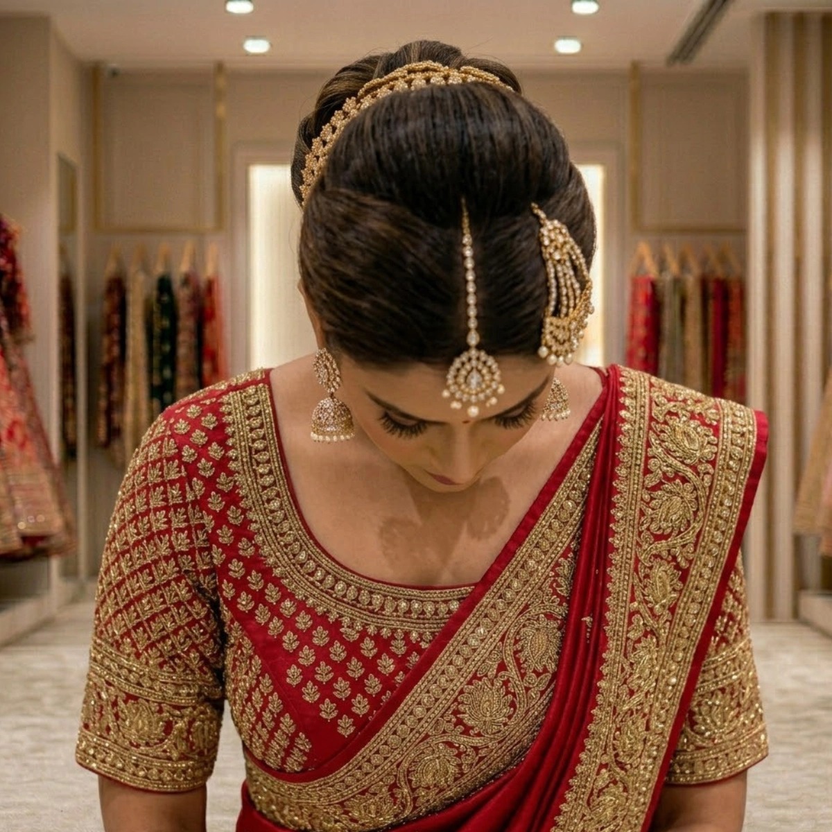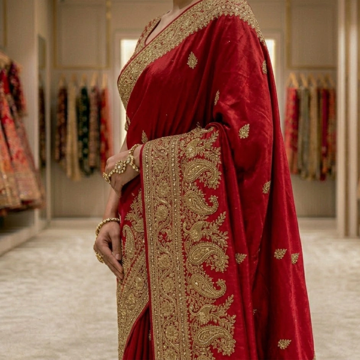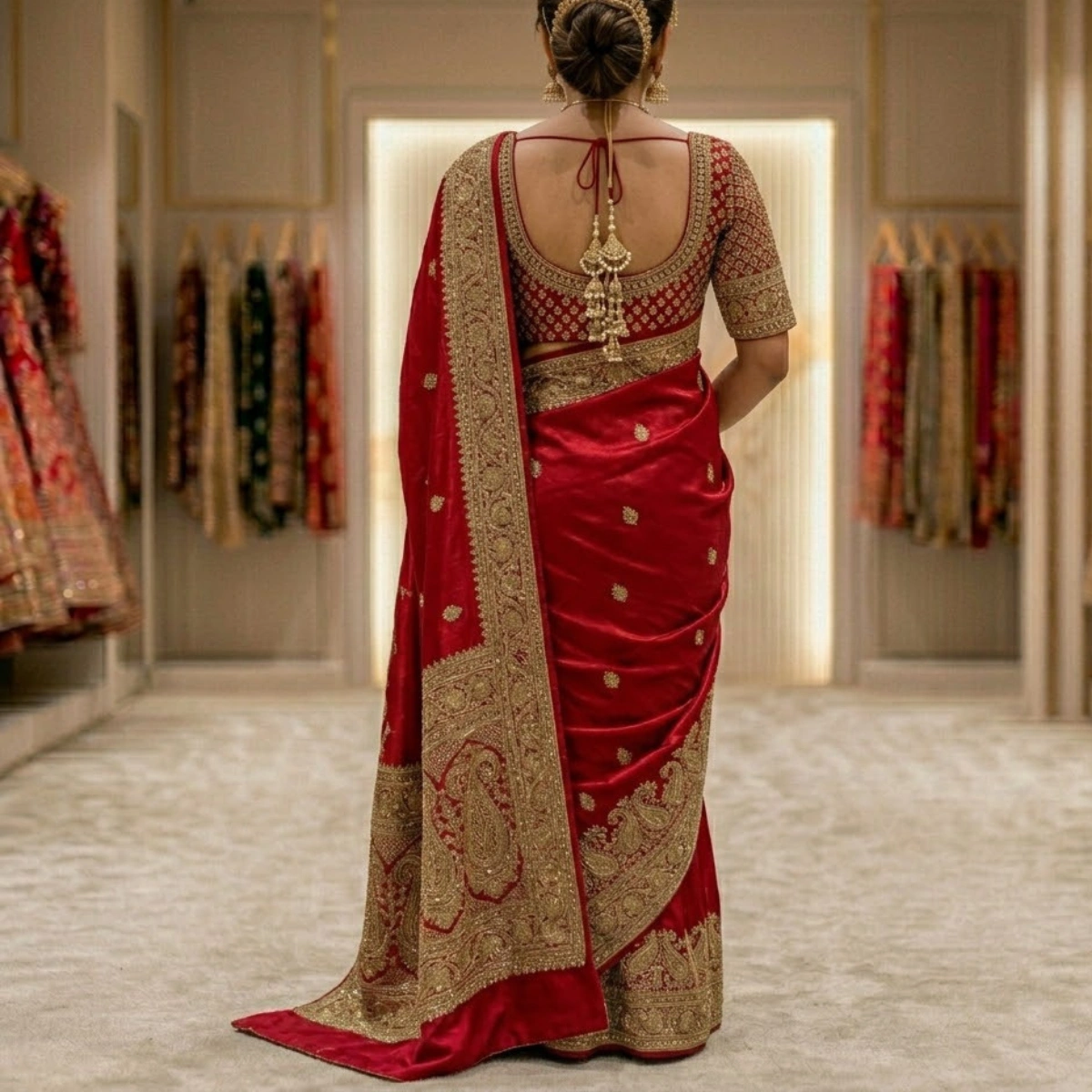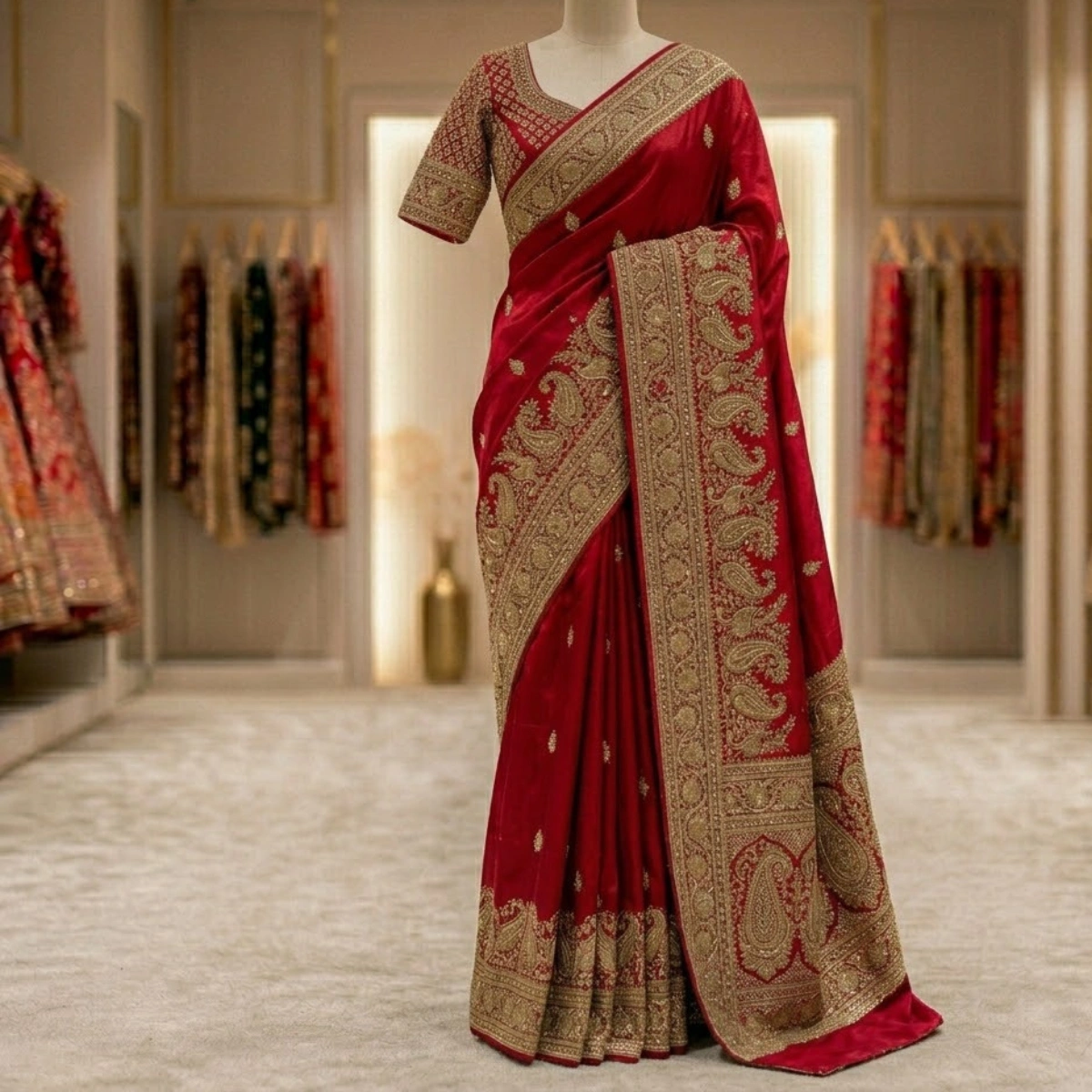 A timeless red wedding saree designed for traditional ceremonies and rituals. Featuring classic patterns and rich fabric, this saree reflects cultural elegance and grace. Perfect for brides and wedding functions, it adds a traditional touch to your special moments.